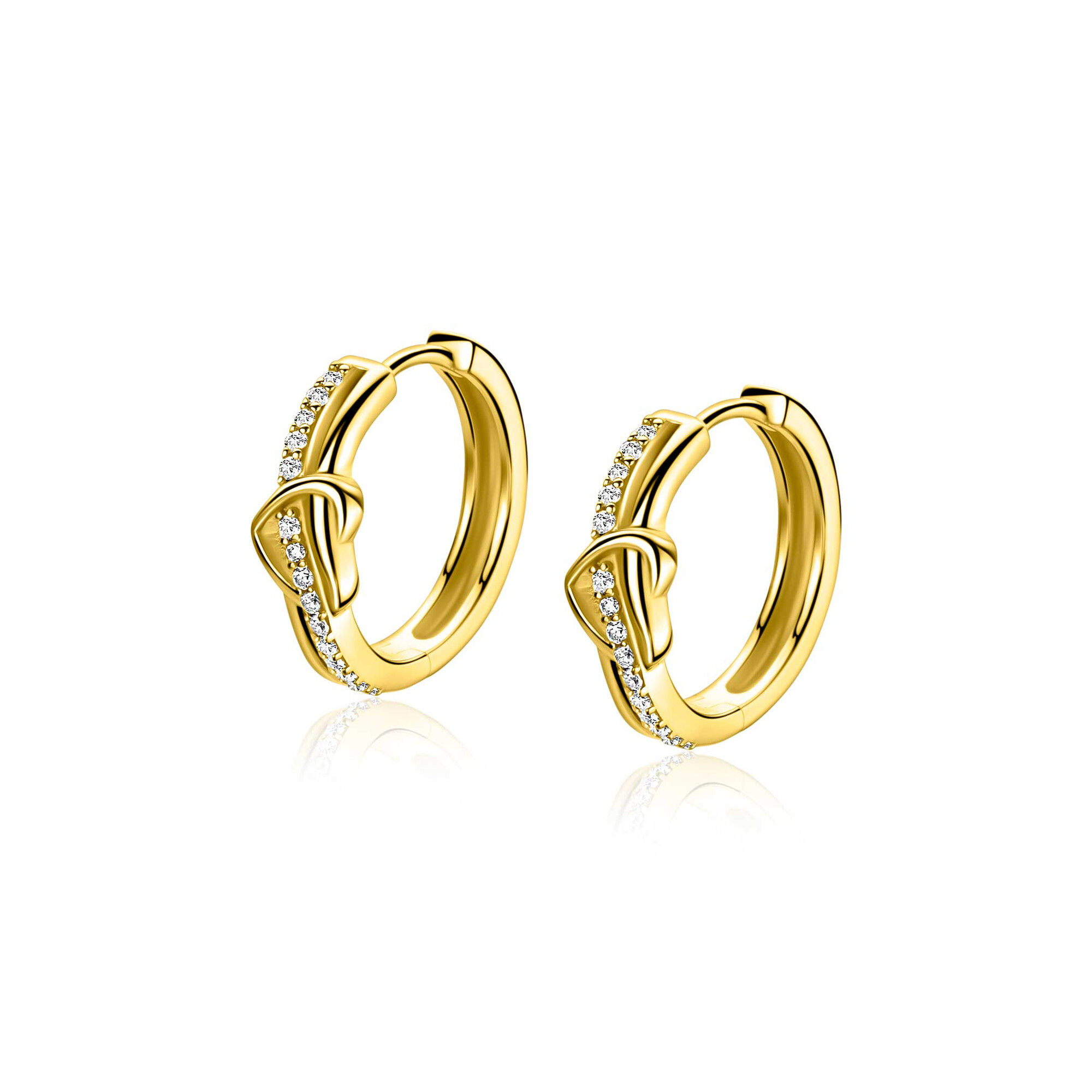 ZINZI gold plated zilveren oorringen (15mm) met een opengewerkt sierlijk hart waarbij een rij witte zirkonia’s vloeiend door het hart loopt. Buisdikte 5mm en met luxe klapsluiting. Vervaardigd van eerste gehalte zilver (925) en extra geel verguld.