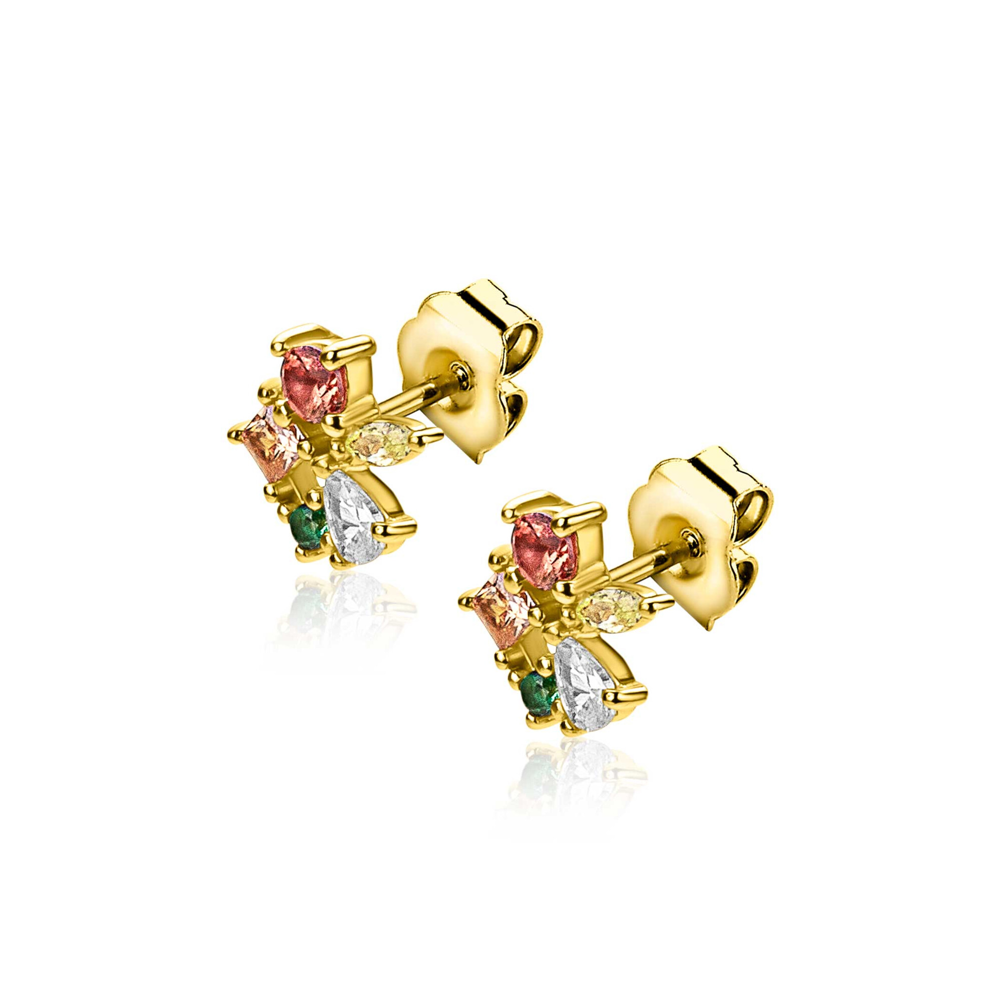 ZINZI gold plated zilveren oorstekers 8mm bezet met een speelse combinatie van bruine, groene en witte kleurstenen in verschillende slijpvormen. De mix van ronde, vierkante, druppel- en markiesvormige stenen geeft deze oorstekers een kleurrijke uitstraling. Vervaardigd van eerste gehalte zilver (925) en extra geel verguld.