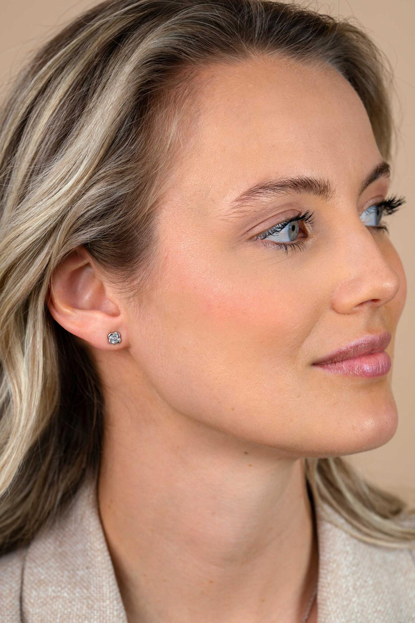 ZINZI zilveren oorstekers met een roosje (6mm), bezet met een witte zirkonia in het midden. De sierlijk gevormde roos geeft de oorknoppen een elegante uitstraling. Vervaardigd van eerste gehalte zilver (925) en voorzien van een extra rodiumlaag voor een langdurige glans.