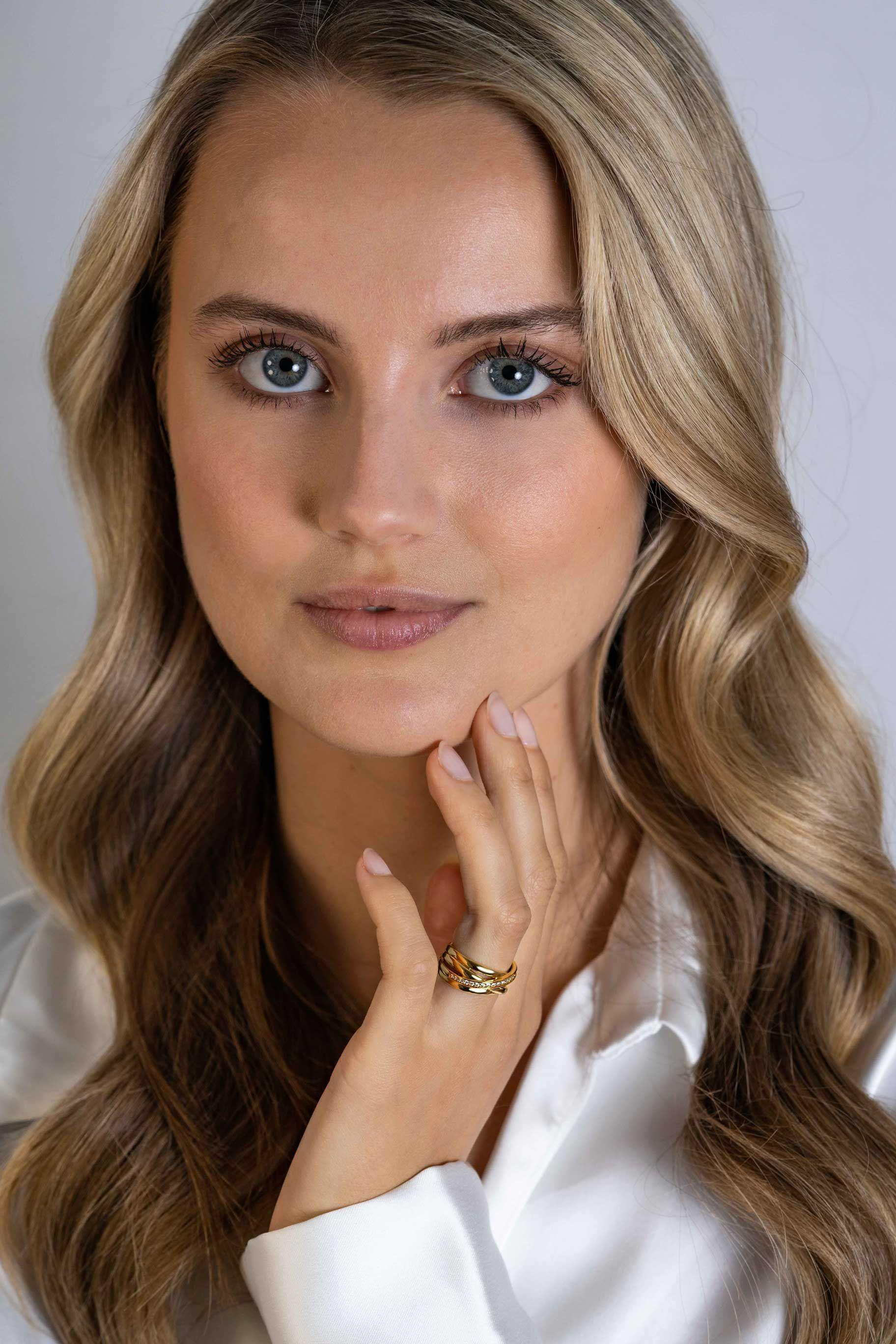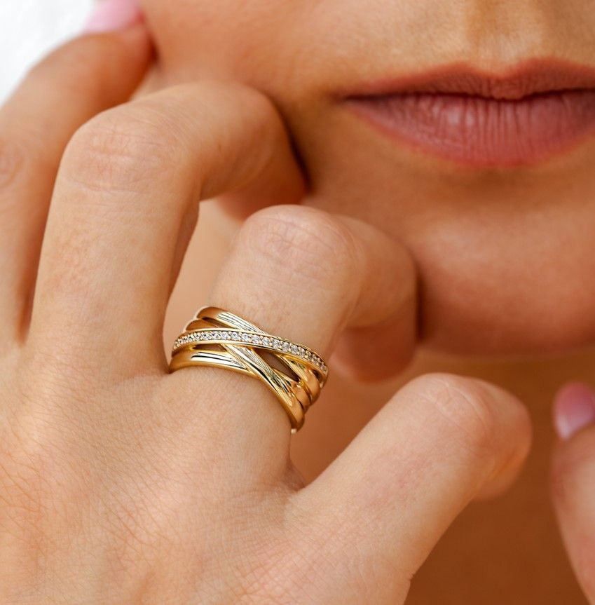 ZINZI gold plated zilveren brede cross-over ring, waarbij drie gladde banden en een band bezet met witte zirconia's elkaar kruisen. De ring is vervaardigd van eerste gehalte zilver (925) en voorzien van extra 14K geel vergulding.