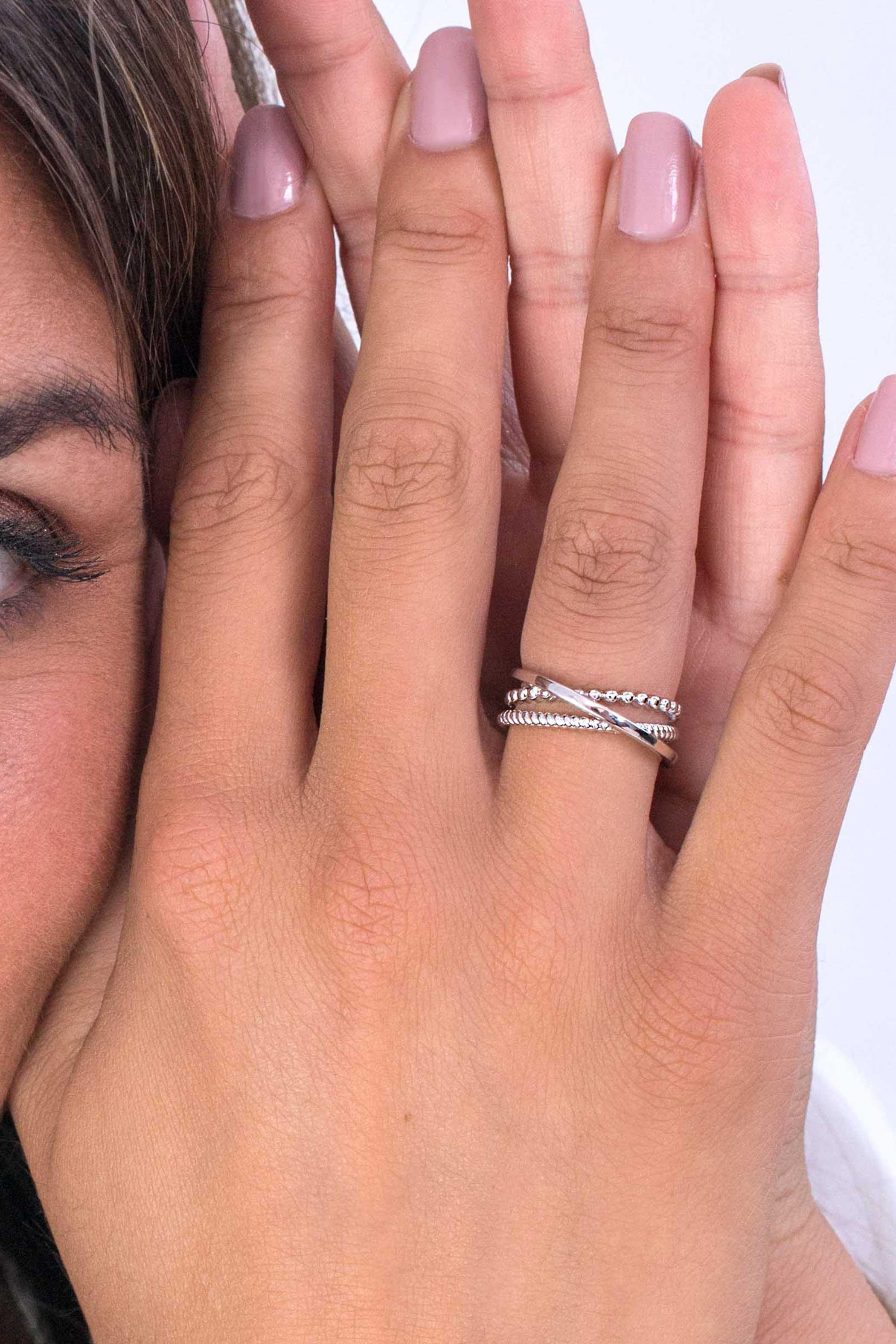 ZINZI zilveren cross-over ring. Een mooie combinatie van drie ringen, waarbij de gladde ring over de bolletjes en gedraaide ring gaat. Vervaardigd van eerste gehalte zilver (925) en met extra rodiumlaag voor een langdurige glans.