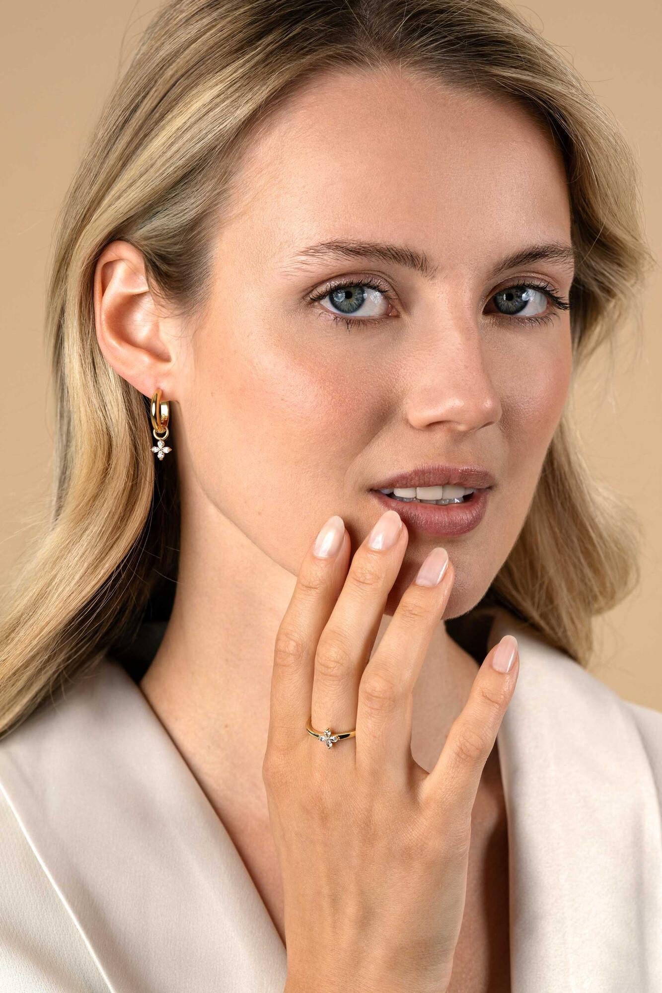 ZINZI gold plated zilveren ring met bloem (7,5mm), bezet met vier druppelvormige witte zirconia's. Vervaardigd van eerste gehalte zilver (925) en extra geel verguld.
