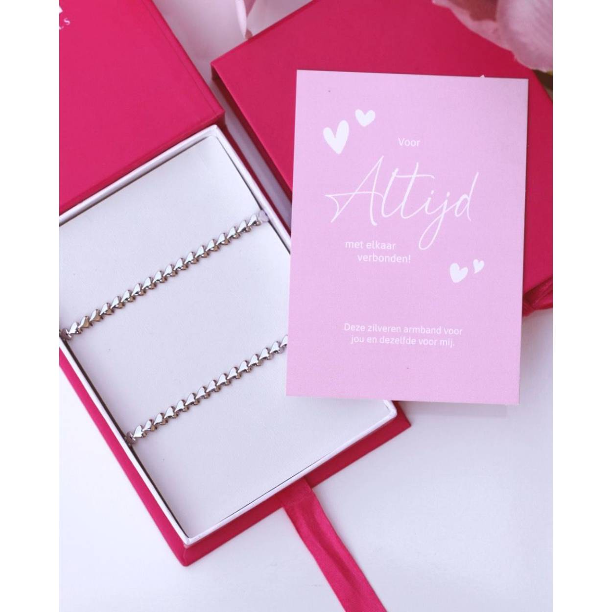 ZINZI set van 2 zilveren armbanden geel verguld in hartvorm. 'Altijd met elkaar verbonden' door deze 2 armbandjes. Geef dit armbandje aan je moeder, vriendin of zus en draag zelf de ander. Inclusief 'Altijd met elkaar verbonden' kaartje in de mooie Zinzi cadeauverpakking. De lengte van de armband is te variëren van 17 tot 19cm. Met herkenbaar ZINZI hartje bij de sluiting. Vervaardigd van eerste gehalte zilver (925) en extra geel verguld.