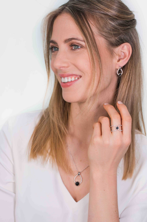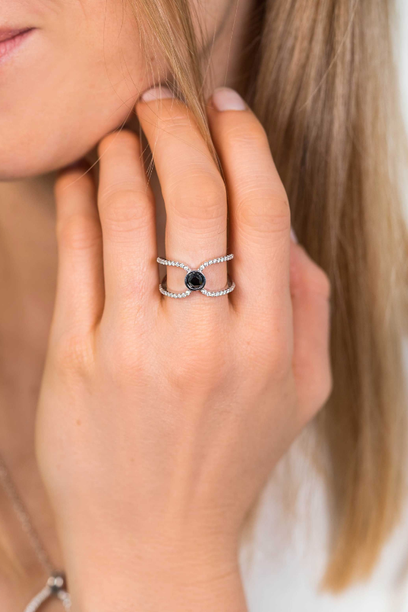 ZINZI zilveren multi-look ring, waarbij het lijkt alsof er twee ringen met elkaar verboden zijn. In het midden, waar de banen bij elkaar komen, is een zwarte zirconia in een ronde zetting gezet. De ring is vervaardigd van eerste gehalte zilver (925) en voorzien van een extra rodiumlaag voor langdurige glans.