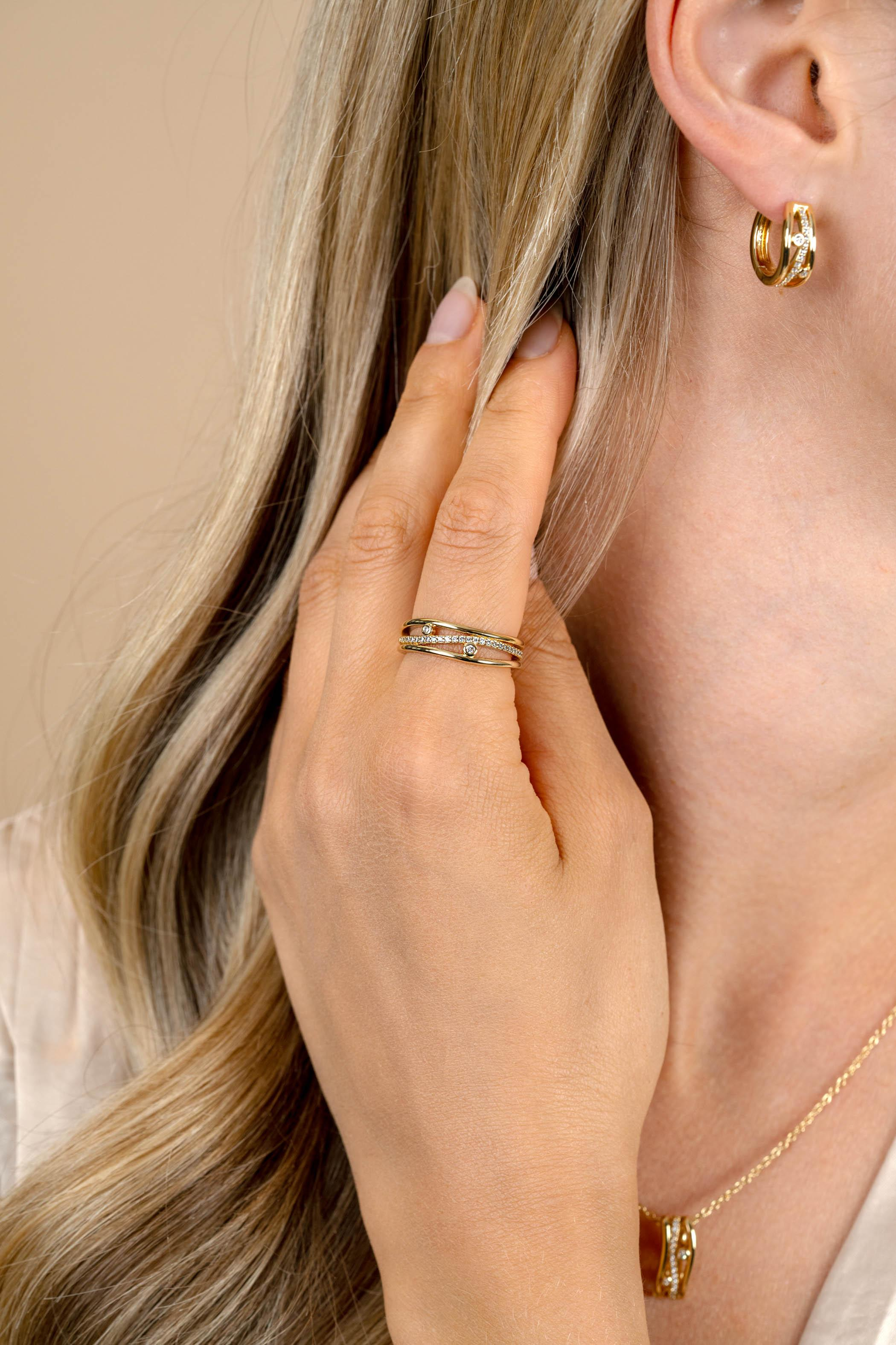 ZINZI gold plated zilveren multi-look ring (6mm breed) in golvend design. De middelste baan is vol bezet met witte zirkonia's en twee ronde zirkonia's zijn speels verdeeld over de ring. Vervaardigd van eerste gehalte zilver (925) en extra geel verguld.